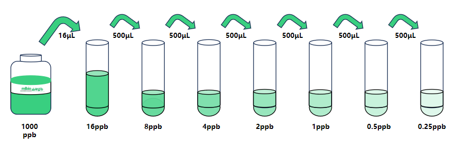 試劑盒中取出標準品,準備7個試管,先將1000ppb標準品(200µL)按需吸取一定量用1×稀釋液稀釋至16ppb(例:16µL的標準品母液+984µL的1×稀釋液,制備得到1000μL的16ppb濃度標準品),隨后在6個試管中分別加入500μL的1×稀釋液,在這6個單獨的試管中將16ppb標準品依次2倍倍比稀釋至7個梯度,共配制7個濃度的標準品,依次為:16ppb、8ppb、4ppb、2ppb、1ppb、0.5ppb、0.25ppb,從最高濃度標準品溶液中吸取500μL標準品到下一個試管中,輕輕吹打混勻,以此類推進行標準品的倍比稀釋(如圖所示),1×稀釋液用作零濃度標準品(0ppb)。