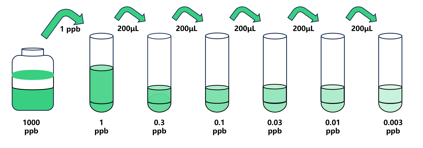 試劑盒中取出標準品,準備7個試管,先將1000ppb標準品(200µL)按需吸取一定量用1×稀釋液稀釋至1ppb(例:1µL的標準品母液+999µL的1×稀釋液,制備得到1000μL的1ppb濃度標準品),隨后在5個試管中分別加入400μL的1×稀釋液,在這6個單獨的試管中將1ppb標準品依次3倍倍比稀釋至5個梯度,共配制5個濃度的標準品,依次為:1ppb、0.3ppb、0.1ppb、0.03ppb、0.01ppb、0.003ppb,從最高濃度標準品溶液中吸取200μL標準品到下一個試管中,輕輕吹打混勻,以此類推進行標準品的倍比稀釋(如圖所示),1×稀釋液用作零濃度標準品(0ppb)。