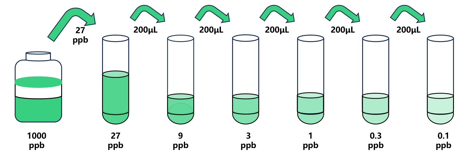 試劑盒中取出標(biāo)準(zhǔn)品,準(zhǔn)備7個(gè)試管,先將1000ppb標(biāo)準(zhǔn)品(200µL)按需吸取一定量用1×稀釋液稀釋至27ppb(例:27µL的標(biāo)準(zhǔn)品母液+973µL的1×稀釋液,制備得到1000μL的27ppb濃度標(biāo)準(zhǔn)品),隨后在5個(gè)試管中分別加入400μL的1×稀釋液,在這5個(gè)單獨(dú)的試管中將27ppb標(biāo)準(zhǔn)品依次3倍倍比稀釋至5個(gè)梯度,共配制6個(gè)濃度的標(biāo)準(zhǔn)品,依次為:27ppb、9ppb、3ppb、1ppb、0.3ppb、0.1ppb,從最高濃度標(biāo)準(zhǔn)品溶液中吸取200μL標(biāo)準(zhǔn)品到下一個(gè)試管中,輕輕吹打混勻,以此類推進(jìn)行標(biāo)準(zhǔn)品的倍比稀釋(如圖所示),1×稀釋液用作零濃度標(biāo)準(zhǔn)品(0ppb)。