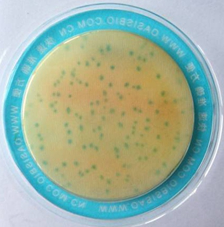 呈藍綠色的菌落為阪崎腸桿菌。出現(xiàn)陽性菌落的樣本,最好用其他更為可靠的方法進行驗證,或者至少再取樣重復(fù)檢驗一次。
